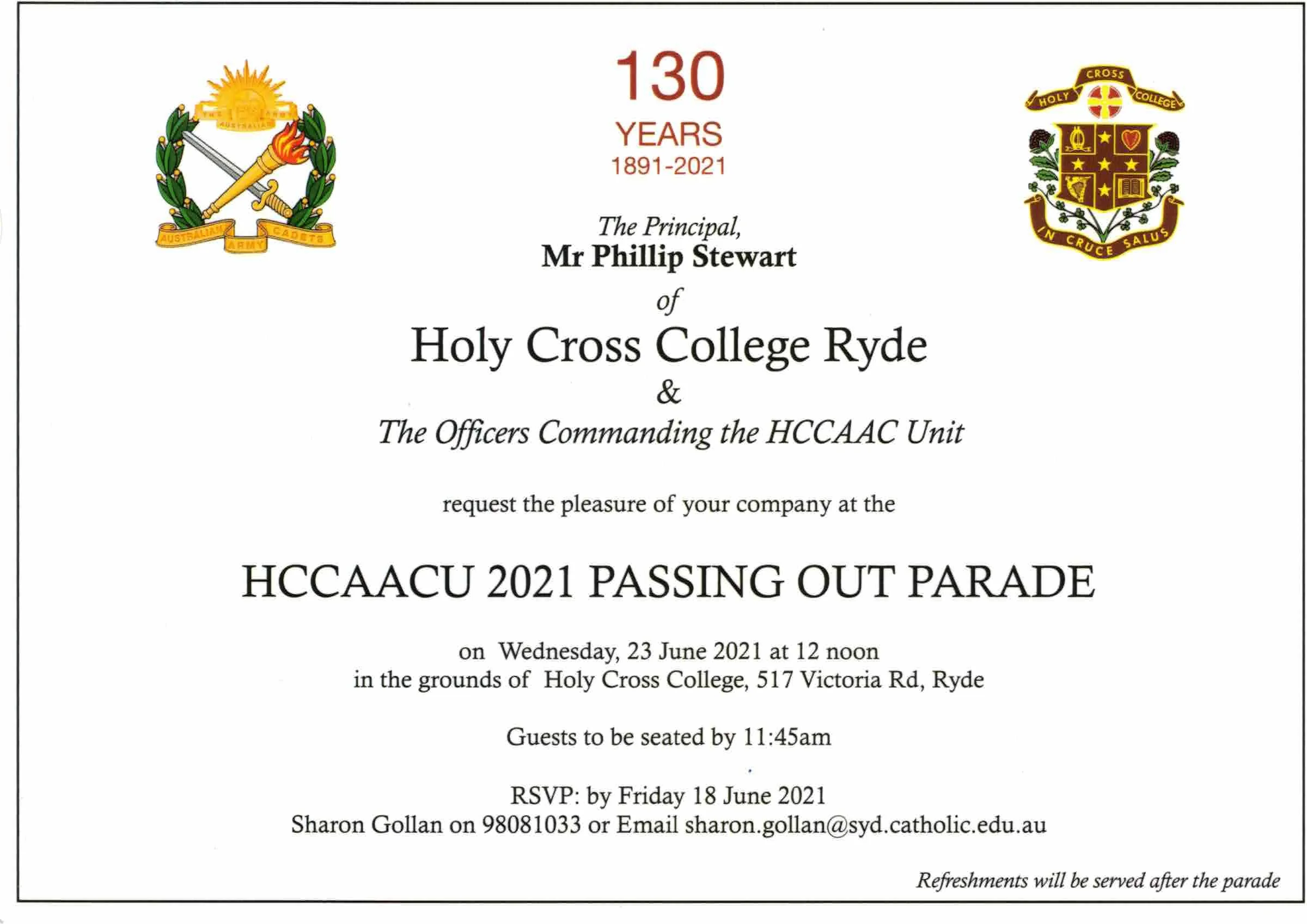 PICTURED : Invitation to the Holy Cross College Cadet Unit Passing Out Parade 2021.